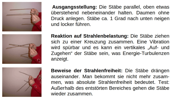 Zur Selbstkontrolle können Sie Messstäbe wie in der folgenden Abbildung verwenden. Die Stäbe werden im Abstand von 10 cm nebeneinander gehalten. Die Stäbe sollen frei beweglich sein, also nicht zu fest halten. Bei Strahlenbelastung kreuzen sich die Stäbe, Nach der Entstörung gehen die Stäbe auseinander.